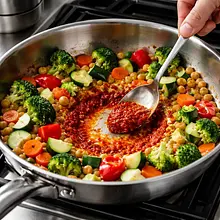 Make a space in the center of the pan and add 30 g of red curry paste. Fry the paste for 1-2 minutes, stirring, until it releases an intense aroma and lightly toasts — the paste should darken and stop smelling 'raw'. After this time, mix the paste thoroughly with the sautéed onion, garlic, and ginger.
