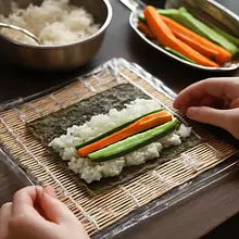 Prepare a bamboo mat (makisu) and optionally a sheet of plastic wrap (to prevent the rice from sticking). Place a sheet of nori on the mat with the shiny side down (the matte side will be on the outside when rolled). Wet your hands with water (with a little rice vinegar to prevent the rice from sticking to your hands). Spread a thin layer of rice on the nori — leave about 2 cm of free edge on the opposite side (this free edge will be used to seal the roll). Use about 60-70 g of rice per sheet (the amount depends on the thickness of the rice). Distribute the rice evenly, without pressing it down too hard.