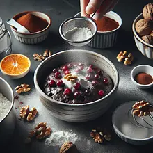 Moist, intensely chocolatey brownie with crunchy walnuts and sweet-sour cranberries, complemented by the aroma of orange zest and espresso. Inspired by classic brownies, but with a personal touch: warm cranberry jam made from dried cranberries and slightly browned butter for a deeper, nutty flavor. The result is a cake with a dense, chewy texture, featuring distinct pieces of nuts and a marbled pattern of cranberries, drizzled with a delicate dark chocolate glaze. Perfect as a dessert with coffee, for a gathering with friends, or as an elegant option for the holiday table. Serve slightly warm with a scoop of vanilla ice cream or completely cooled as a sweeter snack — the appearance and taste attract both chocolate lovers and those who enjoy a sweet-sour contrast.