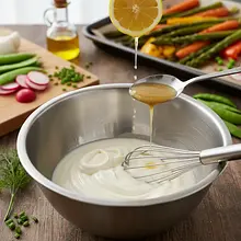 In a medium bowl, combine Greek yogurt, light mayonnaise, Dijon mustard, and lemon juice. Add chopped herbs, a pinch of salt, and freshly ground pepper. Mix everything thoroughly with a small whisk or spoon until you achieve a smooth, uniform sauce. Taste and adjust seasoning with more salt or pepper if needed.