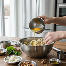 Przygotuj masę jajeczno-serową. W średniej wielkości misce roztrzep dwa jajka (120g) za pomocą trzepaczki. Dodaj śmietankę 30% i wymieszaj do połączenia. Pokrusz w dłoniach około 100g koziego sera i dodaj do masy. Dopraw solą, świeżo mielonym pieprzem i opcjonalnie szczyptą świeżo startej gałki muszkatołowej. Całość dokładnie wymieszaj, aż uzyskasz jednolitą, kremową masę.