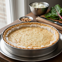 Przygotuj formę i rozwałkuj ciasto. Wyjmij schłodzone ciasto z lodówki. Przygotuj formę do tarty o średnicy 24-26 cm, najlepiej z wyjmowanym dnem. Nie musisz jej smarować tłuszczem, ciasto ma go w sobie wystarczająco. Oprósz lekko mąką blat lub stolnicę oraz wałek. Rozwałkuj ciasto na okrągły placek o grubości około 3-4 mm i średnicy większej niż forma. Nawijając ciasto luźno na wałek, przenieś je nad formę i delikatnie rozwiń. Dokładnie wylep ciastem dno i boki formy, dociskając je palcami. Nadmiar ciasta odetnij nożem, przejeżdżając nim po górnej krawędzi formy.