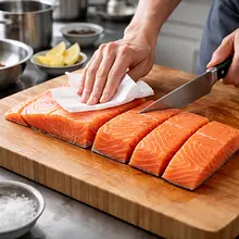 Prepare the surface of the salmon: pat the fillet dry with a paper towel, cut into 4 equal portions of about 150 g each. Place the pieces in a shallow dish and drizzle with 2/3 of the prepared dressing — gently massage the marinade with your hand or a spoon over the top to coat evenly. Set aside for 15–20 minutes in a cool place (no longer than 30 minutes, so the miso doesn't "cook" the fish).
