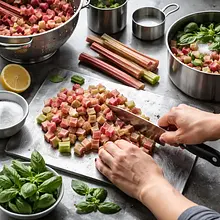 Prepare the rhubarb-basil syrup. Cut the rhubarb into pieces about 2 cm long (you don't need to peel it, but remove the fibrous ends). Place 300 g of chopped rhubarb, 150 g of sugar, and 500 ml of water in a wide saucepan. Add 6 g (about a handful) of basil leaves (set aside a few leaves for decoration). Heat over medium heat until the syrup begins to gently boil, stirring with a wooden spoon to dissolve the sugar. Reduce the heat and simmer for 8-10 minutes, until the rhubarb breaks down and releases its juice — the mixture should be soft and intensely pink. Turn off the heat and let it cool slightly (5 minutes).
