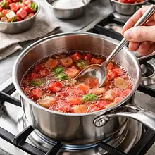 Reduce the heat to low and cook the syrup for 10–12 minutes, stirring occasionally. The syrup is ready when the fruit pieces break down and the liquid thickens to the consistency of a thin jam - when a spoon leaves a visible trail. Remove from heat and let cool for 10 minutes.