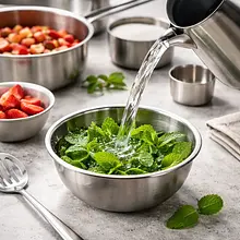 Prepare a cool mint infusion: pour 30 g of fresh mint with 60 ml of boiling water, let it sit for 6–7 minutes, then strain and cool completely (you can chill it in the fridge for 10–15 minutes). In a clean, degreased bowl, place 60 g of egg whites. Add 1 pinch of salt (1 g) and beat with a mixer on medium speed until the egg whites start to form soft peaks (about 1–2 minutes). Gradually add 30 g of powdered sugar, one tablespoon at a time, while continuing to beat until glossy, stiff peaks form (about 2–3 minutes). Once the meringue is stiff, very slowly introduce the cooled mint infusion (teaspoon by teaspoon) while mixing on low speed, until the meringue takes on a delicate mint aroma and a consistency that holds its shape.