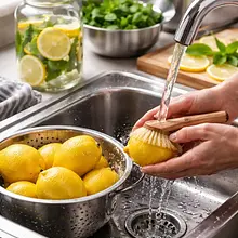 Wash the lemons under cold running water, rubbing the skin with your hand or a vegetable brush to remove wax and impurities. After washing, place the lemon on the countertop and roll it firmly with your hand, pressing down — this will help release the juice. Cut each lemon in half. Place the halves on the juicer and squeeze the juice into a bowl or directly into a strainer over a jug, which will catch the seeds and larger pulp. If you like, set aside 2 slices from one lemon for decoration, cutting them thinly (about 3 mm).