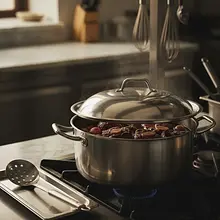 Do zredukowanego wina i warzyw włóż z powrotem obsmażone policzki wołowe. Wlej gorący bulion wołowy, tak aby mięso było prawie całkowicie przykryte. Dodaj liście laurowe, ziele angielskie i gałązki świeżego tymianku. Doprowadź całość do wrzenia, a następnie natychmiast zmniejsz ogień do absolutnego minimum.