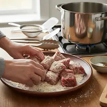 Na dużym, płaskim talerzu wymieszaj mąkę z solą (około 1 łyżeczki) i świeżo zmielonym pieprzem. Obtocz każdy kawałek osuszonej wołowiny w tej mieszance, strzepując nadmiar mąki. W dużym, ciężkim garnku (najlepiej żeliwnym typu 'dutch oven') rozgrzej 2 łyżki oleju na średnio-wysokim ogniu. Gdy olej będzie gorący (powinien lekko mienić się na patelni), układaj kawałki mięsa jedną warstwą, nie przepełniając garnka. Smaż partiami przez 3-4 minuty z każdej strony, aż będą głęboko brązowe. Zrumienione mięso przekładaj na osobny talerz.