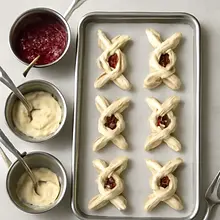 Roll out the sheet of puff pastry on a lightly floured surface (or on parchment paper). If you have two thin sheets, you can stick them together with a short press. Gently roll with a rolling pin into a rectangle about 3–4 mm thick (not too thin). Cut the rectangle into 12 smaller rectangles of 8×10 cm (you can use a ruler). Spread a thin line of jam along the center of each rectangle, leaving a 8–10 mm margin at the edges. Brush the edges with beaten egg (about 1/2 egg for the entire batch), fold each rectangle in half along the longer side so that the jam is in the middle. Press the edges with your fingers to seal (be careful not to squeeze the jam out). Then cut each folded rectangle into 2–3 strips about 2–3 cm wide and twist each strip a few times to create a ribbon. Tuck the ends gently underneath to prevent them from unraveling.