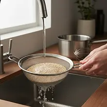 Start by cooking the quinoa. Place 100g of quinoa in a very fine sieve and rinse it thoroughly under cold running water for about a minute. Rub the grains with your hands to remove the saponins that give a bitter taste. Then transfer the rinsed quinoa to a small pot, add 200 ml of cold water (ratio 1:2) and a pinch of salt. Bring to a boil, then reduce the heat to the minimum, cover the pot, and cook for about 15 minutes, until the quinoa has absorbed all the water. Remove from heat and let it sit covered for another 5 minutes. Finally, gently fluff it with a fork.