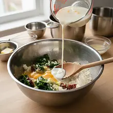 Add the cooled spinach with onion, crumbled feta, and chopped sun-dried tomatoes to the batter. Using a spatula, gently mix the additions with the batter, making only a few movements to distribute them evenly while still avoiding excessive mixing.