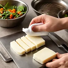 Cut the halloumi (225 g) into slices about 1 cm thick. Pat the slices dry with a paper towel to remove excess moisture, which will improve browning. Heat a grill pan or a regular non-stick pan over medium-high heat for about 2-3 minutes (the pan should be well heated). If using a regular pan, add 1 teaspoon of oil and spread it with a brush. Arrange the halloumi slices in a single layer in the pan, do not overcrowd it. Fry for about 1.5–2 minutes on each side until golden brown with a slightly crispy crust and clear grill marks. The finished cheese should be golden on the outside and springy on the inside—do not fry for too long, as it will become hard and rubbery.