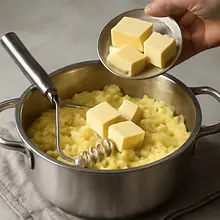 Add 100 g of butter in pieces (cut into smaller pieces makes it easier to mix) to the potatoes. Using a potato masher or ricer, mash the potatoes vigorously until they are free of lumps and start to have a smooth, fluffy consistency. If using a ricer, process in batches. After the initial mashing, gradually start adding warm milk (first 100 ml, then the rest if needed), mixing with a wooden spoon or spatula until the puree reaches the desired smoothness.