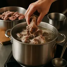 Place the meat in a very large pot and cover it with cold water (about 3.5 l). Bring to a boil over high heat. When the water starts to boil vigorously, cook for 5 minutes to wash away impurities. Then drain the water, rinse the meat under running water, and wash the pot.
