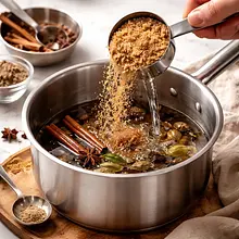 Water, Brown sugar, Loose black tea, Fresh ginger, Cinnamon stick, Cardamom, Whole clove, Star anise