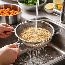 Rinse 200 g of quinoa in a fine sieve under cold running water for about 30–60 seconds, rubbing the grains with your fingers until the water runs clear. Transfer to a medium pot (capacity ~2 l), add 400 ml of water and 1 g of salt (a pinch). Bring to a boil over high heat, cover with a lid, reduce the heat to low, and cook for 12–15 minutes, until the grains swell and the water is absorbed. Remove from heat, let sit covered for 5 minutes, then fluff with a fork.