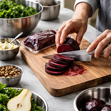 Faster method: if you have already roasted beets or they are in a vacuum bag, cut them right away. If not — wash the beets under running water, trim the ends (keep the leaves or cut them off if they are very large), wrap each beet individually in aluminum foil. Preheat the oven to 200°C (top-bottom). Place the wrapped beets on a baking sheet and bake for 35-40 minutes; small beets will be ready in about 30 minutes. Check with a skewer — it should slide smoothly into the center of the beet. After baking, cool for 10 minutes, remove the foil, and peel off the skin (it should come off easily with your fingers or a knife). Cut the beets into slices about 5 mm thick.