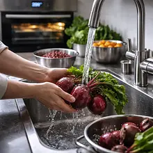 Preheat the oven to 200°C (top-bottom) or 180°C with fan. Wash the beets under running water, trim the leaves (leave about 1 cm of the stem to prevent juice from leaking) and remove any small roots. If the beets are very large, cut them in half. Pat dry with a paper towel.