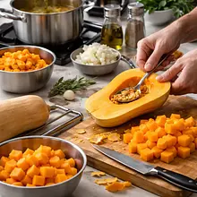 Creamy, warming casserole that combines sweet butternut squash with delicate potatoes and melting cheese — the perfect comfort food for a winter day. This dish is inspired by a classic gratin, enriched with sautéed onions and the aroma of thyme and nutmeg. You can add crunchy pieces of smoked bacon for a contrast in textures or serve it vegetarian without meat. Serve as a main dish with a simple green salad or tangy pickled cucumber. Visually stunning with layers of orange and white slices and a golden, slightly browned cheese crust.