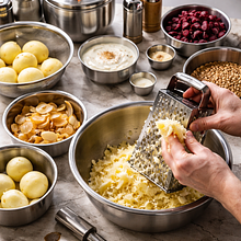 Transfer the grated potato and onion mixture to a clean, thick kitchen towel (muslin, linen towel) or a handkerchief and squeeze out as much liquid as possible. Hold it over a bowl — you can collect the starch that settles at the bottom. After squeezing, discard the drained liquid. Transfer the dry mixture back to a dry bowl.