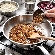 Heat a dry skillet with a diameter of 24-26 cm over medium heat. Add 100 g of dry buckwheat and toast for 4-6 minutes, stirring constantly with a wooden spoon — the grains should take on a golden-brown color and emit a nutty aroma. Once they reach this color, add 30 g of butter and continue to cook for 3-4 minutes, allowing the butter to coat the grains and lightly caramelize them. Transfer the hot buckwheat to a flat plate lined with paper towels, spread it in a thin layer, and set aside to cool completely — during this time, they will become crispy.