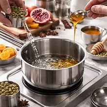 Prepare the syrup: in a medium saucepan, pour in 120 ml of water, add 80 g of honey, crushed 8 pieces of cardamom pods (use your hands or a knife to lightly crush), 6 pieces of star anise, and 30 g of ginger sliced thinly. Bring to a gentle boil over medium heat, stirring with a wooden spoon to ensure the honey dissolves evenly. Reduce the heat and simmer for 8–10 minutes – the syrup should thicken slightly and have an intense spice aroma.