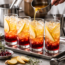 Prepare the syrup: peel the pears and cut the flesh into cubes about 1 cm on each side. Peel and finely grate the ginger (you can leave some thin slices for decoration). In a medium saucepan, combine 400 g of chopped pears, 30 g of grated ginger, 200 g of sugar, and 200 ml of water. Heat over medium heat, stirring with a wooden spoon, until the sugar dissolves (about 4-6 minutes). Reduce the heat and simmer gently for 15-20 minutes, until the pears are soft and the syrup thickens. Use an immersion blender (or transfer to a standing blender) and blend until smooth. Strain through a fine sieve, pressing down with a spoon to obtain a clear syrup (the leftover pulp can be used for dessert). If you want a thicker syrup, continue cooking over low heat for another 5-10 minutes. Finally, add 60 ml of lemon juice, mix, and set aside to cool.