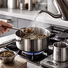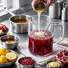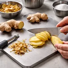 Prepare ginger syrup: peel fresh ginger (60 g) and slice it into thin pieces about 2-3 mm thick. In a small saucepan, place the ginger slices and add 100 g of sugar and 200 ml of filtered water. Stir with a wooden spoon, bring to a boil over medium heat, then reduce the heat to low and simmer gently for 12-15 minutes. A light golden syrup with a distinct ginger aroma should form; the syrup should not caramelize strongly — if it becomes too dark, lower the temperature.