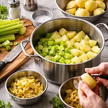 While the vegetables are simmering, prepare the puree: peel the celery and potatoes, and cut them into even pieces. Place them in a large pot and cover with cold water. Add a pinch of salt (about 1 g). Bring to a boil, then cook over medium heat for 20–25 minutes, until the vegetables are soft (a fork should easily pierce them). Drain, reserving a small amount of the cooking water. Heat the milk (150 ml) and butter (50 g) in a small pot until warm (not boiling). Mash the celery and potatoes with a potato masher or an immersion blender, gradually adding the warm milk and butter until you achieve a smooth, creamy consistency. Season with salt and pepper to taste.