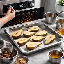 Preheat the oven to 200°C (top-bottom). Line a baking tray with parchment paper. Place the halved pears cut side down on the tray, leaving some space between them. If you want a more intense caramelization, lightly brush with a bit of honey (about 20 g - optional). Bake for 25-30 minutes, until the flesh is soft when pressed with the end of a spoon and the edges begin to caramelize to a golden-brown color.