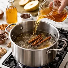 A warming, aromatic winter drink that combines the sweetness of roasted pears with the fruity base of apple cider and deep notes of cinnamon, cardamom, cloves, and star anise. The drink has an amber color, floating soft pear halves, and thin slices of orange — it looks impressive and festive. Perfect for chilly evenings, as a non-alcoholic alternative to mulled wine, and excellent with chocolate desserts or cheesecake. The drink is vegetarian and can easily be made vegan by omitting honey or replacing it with maple syrup.
