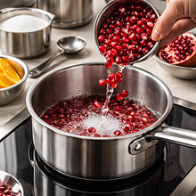 Prepare the syrup: place 220 g of pomegranate seeds (about two-thirds of the prepared seeds) in a medium saucepan, add 200 g of sugar and 150 ml of water. Use a wooden spoon to gently crush the seeds at the bottom of the pot — they do not need to be completely broken down, just enough to release their juice. Set the saucepan over medium-low heat, bring to a gentle boil, and then cook for 10–12 minutes, stirring every minute, until the sugar is completely dissolved and the mixture thickens and takes on an intense, deep color. After cooking, remove from heat, strain through a fine sieve into a clean bowl, pressing the skins and seeds with a spoon to extract as much juice as possible. Add 20 g of lemon juice to the strained syrup and mix. Set aside to cool.