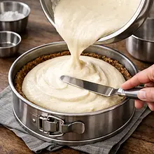 After baking, turn off the oven and crack the door open by about 2–3 cm. Leave the springform pan in the slightly open oven for 45–60 minutes to allow the cheesecake to cool gradually — this will prevent cracks. Then remove it and let it cool completely at room temperature, and then refrigerate for at least 4 hours (preferably overnight).