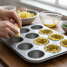 Prepare a muffin tin. Grease each cup with a little butter or oil. Spoon the potato mixture into 4 holes, filling them to the brim. Then, using the bottom of a small glass or your fingers, create a indentation in the center of each portion, forming a nest shape. Place the tin in the preheated oven and bake for about 25-30 minutes, until the nests are golden brown and crispy around the edges.