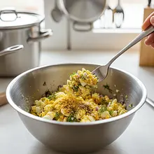 Peel the cooled eggs and grate them on a coarse grater into a large bowl. Add the cooled, sautéed onion along with all the butter it was cooked in to the grated eggs. Add half of the chopped dill (about 15g), 50g of breadcrumbs (about 5 tablespoons), a generous pinch of salt (about 1g), and pepper (about 1g). Additionally, if using, finely chop the chives and add them to the mixture.