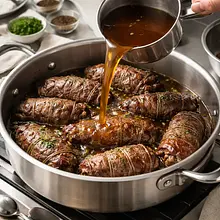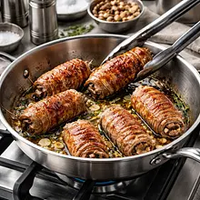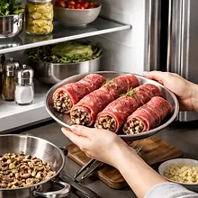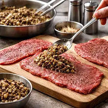 Take the meat out of the fridge about 20-30 minutes before preparation to reach room temperature. Pat the slices of meat dry with a paper towel. If the slices are thick, cut them horizontally in half to achieve a thickness of about 5 mm. Arrange the slices on a board and gently pound them with a meat mallet through plastic wrap, making short strikes across the entire surface — the goal is to flatten and obtain thin, tender slices.
