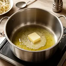 In a large, wide pot with a thick bottom (preferably 26-28 cm), heat the butter (50 g) with the oil (15 g) over medium heat. When the butter melts and starts to sizzle slightly (about 1-2 minutes), add all the chopped onions. Stir with a wooden spoon to ensure the onions are evenly coated with fat. Cook over medium-low heat for 25-35 minutes, stirring every 3-5 minutes — the onions should gradually soften, become translucent, then golden, and finally deep brown and sweet. After about 10-12 minutes, add the sugar (10 g) and continue cooking to speed up the caramelization. If the edges start to burn too quickly, reduce the heat.