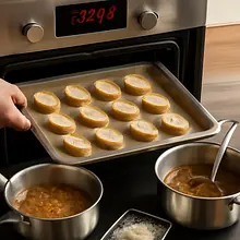Preheat the oven to 220°C (top-bottom) or broil function. Place the baguette slices (240 g) on a baking sheet and toast in the oven for 6-8 minutes until golden and crispy, turning halfway through. On each slice, place a generous layer of grated cheese (about 50 g of cheese per slice, 200 g total) and put them back in the oven for 2-4 minutes to melt and slightly brown the cheese. Alternatively: you can bake the soup in ovenproof bowls — pour the soup into the bowls, place one or two slices with cheese on top, and bake everything for 5-7 minutes until the cheese is browned.