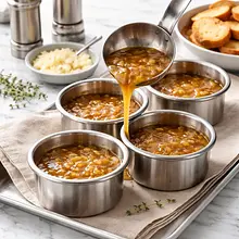 Unbaked soup can be stored in the refrigerator for up to 2 days in an airtight container. Keep the croutons and grated cheese separate and add them just before baking. Reheating: heat the soup in a pot over low heat, then transfer to oven-safe bowls, add the croutons and cheese, and bake under the broiler for 3-5 minutes. Freezing soup with added cheese and croutons is not recommended.