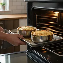 Ostrożnie wstaw blachę z miseczkami do rozgrzanego piekarnika. Ustaw ją na górnej półce, blisko grzałki. Zapiekaj przez około 5-10 minut, lub do momentu, aż ser całkowicie się rozpuści, zacznie apetycznie bulgotać i przyrumieni się na złoto-brązowy kolor. Podawaj natychmiast, póki jest gorąca.