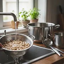 Dzień przed gotowaniem zupy, wieczorem, wsyp suchą fasolę na duży talerz lub blat. Dokładnie ją przejrzyj, usuwając wszelkie zanieczyszczenia, kamyczki czy uszkodzone ziarna. Następnie przesyp fasolę na duże sito i płucz ją obficie pod zimną, bieżącą wodą przez około minutę, mieszając dłonią, aby wszystkie ziarna zostały umyte.