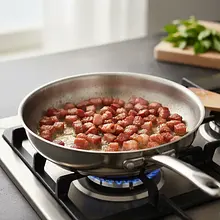 Na dużej, głębokiej patelni (lub w drugim garnku) umieść pokrojony boczek. Podgrzewaj na średnim ogniu, mieszając od czasu do czasu, aż wytopi się z niego tłuszcz, a skwarki staną się złociste i chrupiące (ok. 5-7 minut). Następnie dodaj na patelnię pokrojoną kiełbasę i smaż przez kolejne 3-4 minuty, aż się zarumieni. Na koniec dodaj posiekaną cebulę i smaż wszystko razem, aż cebula się zeszkli i zmięknie (ok. 5 minut). Na ostatnią minutę smażenia dodaj czosnek i ewentualnie wędzoną paprykę, mieszaj, aż czosnek zacznie pachnieć.