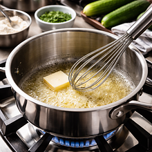 In a small skillet or saucepan, melt 30 g of butter over medium heat. When the butter starts to foam, add 30 g of flour and stir with a whisk or wooden spoon for 1.5–2 minutes, until the mixture turns a light golden color and begins to smell nutty — this is a light roux. Be careful not to burn it (it will smell bitter then).