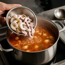 To the boiling soup, first add the squid (200 g) and cook for 2-3 minutes — the squid should change color and become firm (not translucent). Then add the shrimp (300 g) and cook for another 2-3 minutes, until the shrimp turn pink and curl up, and their flesh is no longer translucent.