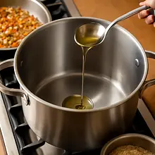 In a large pot (3–4 l capacity), heat the oil over medium heat. When the oil is hot (after about 30 seconds, it will start to shimmer slightly on the surface), add the chopped onion and sauté for 4-5 minutes, stirring every 30–40 seconds, until the onion becomes translucent and lightly golden - this is called sweating the onion.