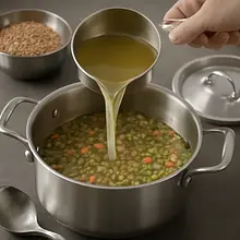 Turn off the heat. Remove the bay leaves and discard them. If you want a creamy soup, use an immersion blender and blend the soup directly in the pot until smooth (blend for 30–60 seconds until you achieve the desired consistency). If you prefer a more rustic texture, leave some whole pieces and strain part of it through a sieve.