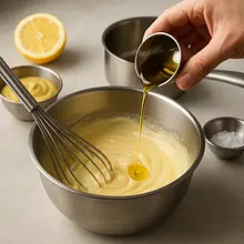 Rozpocznij najważniejszy etap – emulgowanie. Nie przerywając ubijania, zacznij dodawać olej. Pierwsze 50 ml oleju dodawaj dosłownie KROPLA PO KROPLI. Wyobraź sobie kapiący kran – to jest tempo, którego potrzebujesz. Każda kropla musi zostać wchłonięta przez masę jajeczną, zanim dodasz kolejną. Zauważysz, że masa zaczyna powoli gęstnieć i stawać się kremowa.