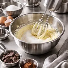W osobnej misie umieść miękkie masło (180 g) i cukier. Ubij mikserem ręcznym lub planetarnym na średnich obrotach przez 3–5 minut, aż masa stanie się jasna i puszysta — będzie widocznie jaśniejsza, a cukier powinien częściowo się rozpuścić.