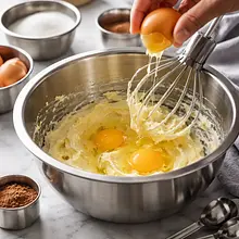 Przesiej mąkę i kakao razem do dużej miski (przez sitko o oczkach ok. 3–4 mm). Dodaj proszek do pieczenia i sól, dokładnie wymieszaj suchą mieszankę drewnianą łyżką lub trzepaczką, aby uniknąć grudek kakao.